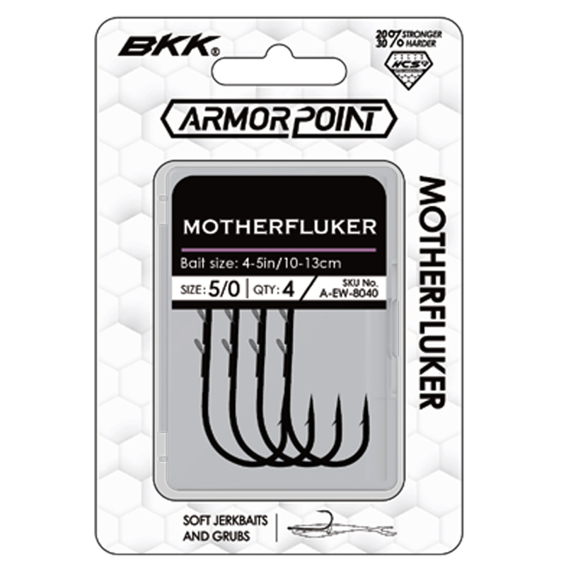 The BKK MOTHERFLUKER is a baitholder-style hook designed specifically for soft plastics. Constructed from Hyper Carbon Steel (HCS), it offers superior strength compared to traditional High-Carbon Steel hooks, providing extra durability and power to handle trophy-sized fish.
